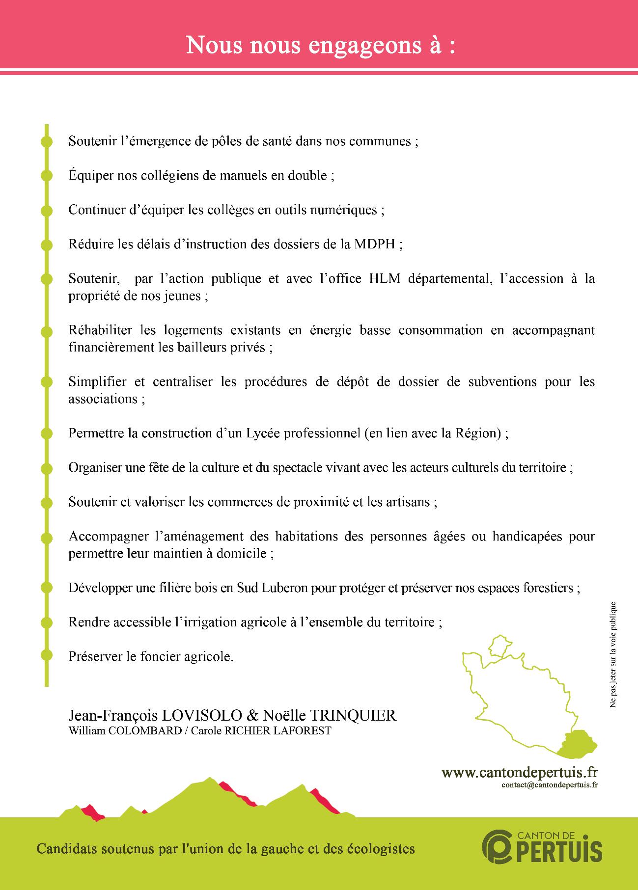 Comme nous l’avons toujours fait, nous nous engageons avec détermination à travailler avec vous toutes et tous, Continuer le travail accompli ces 6 dernières années comme Conseillers départementaux du canton de Pertuis au service du Sud Luberon et de sa population, tel est l’engagement que nous prenons aujourd’hui, si vous nous accordez votre confiance.